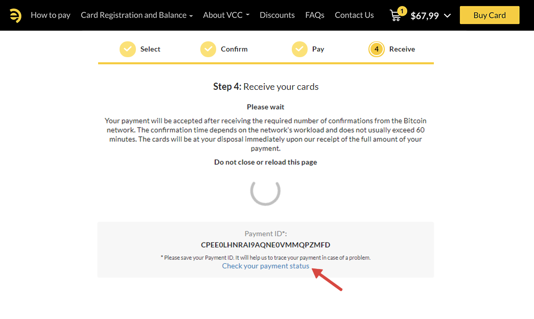To monitor the status of your payment on our website, please click “Check your payment status”.